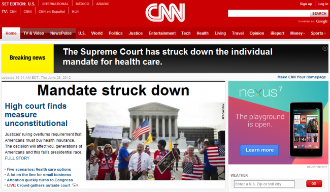The latest example, of course, is Fox News and CNN’s rush to judgment of the Supreme Court’s ruling on healthcare. Both organizations reacted to the initial Court statement by saying the law was struck down, when in fact the core provisions had been upheld. CNN corrected the error (as did Fox), but not before a screen shot of the erroneous report spread throughout the social Web.